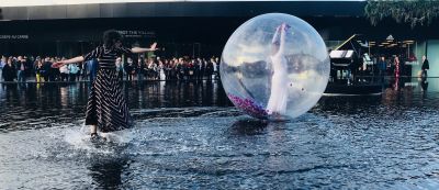 Une prestation visuelle et légère, où l’artiste évolue en danse classique ou contemporaine dans une bulle géante au sol ou sur l’eau.